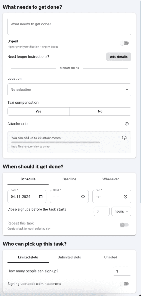 Zelos puts shifts, tasks, events and to-dos into the same format – get something done. Creating the signups is straightforward, but flexible – for example you can create your own custom fields for the information you actually need to convey.